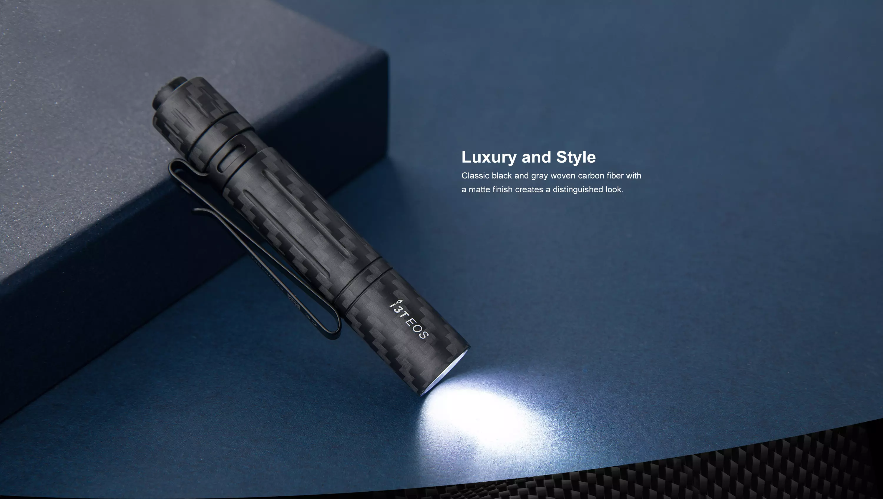 i3T EOS Carbon是一款AAA電池兩級亮度EDC手電。它使用碳纖維外殼,一體化筒身設計堅固又輕巧。手電安裝高性能LED,與PMMA透鏡結合,輸出光線柔和均勻,具有5 / 180lm兩級亮度